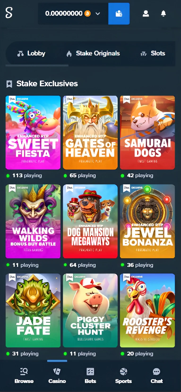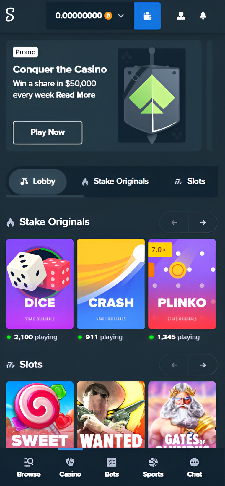 The casino section in the Stake app collects more than 3,400 engaging games of different types. Lots of games are available to play both in demo mode and for real money. The casino is supported by over 40 well-known software companies including such names as Pragmatic Play, NetEnt, Spinomenal, Evolution, Red Tiger, etc.